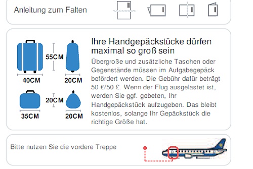 Wer mit wenig Gepäck unterwegs ist kann sich diese Gebühren sparen, ein Trolley bis 10 Kilo Gewicht plus eine kleine Tasche sind kostenlos. Eine Gewichtskontrolle fand bei bisher 3 Flügen aber nicht statt. Pro Passagier ist ein Handgepäcksstück mit einem Gewicht von bis zu 10 kg sowie maximalen Abmessungen von 55 x 40 x 20 cm plus eine kleine Tasche mit maximalen Abmessungen von 35 x 20 x 20 cm zulässig.