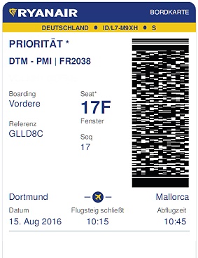 Bordkarten muss man selber ausdrucken, entweder zuhause oder im Hotel. Wer ohne Karte am Flughafen erscheint muss 15 € zahlen um eine zu bekommen. Auf der Bordkarte wird beschrieben wo man einsteigen muss, am vorderen oder hinteren Eingang.