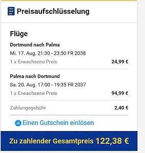 Zusätzlich kann man Versicherungen aller Art abschließen, Gepäckstücke hinzufügen, Priority Boarding und Fast Track buchen, Autos mieten, Parkplätze und Flughafentransfers reservieren und vieles mehr. Aber wir wollen ja billig verreisen und ignorieren das alles. Immerhin muss nicht “nein danke” geklickt werden sondern bei Nichtbeachtung passiert nichts. Wir klicken auf “weiter”....