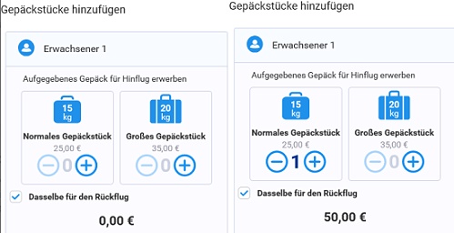 Wer mit Gepäck unterwegs ist sollte dieses gleich bei der Buchung angeben. Die Preise variieren, je nachdem wie schwer der Koffer sein wird - und das muss man schon vorher abschätzen können. Zwischen 15 und 20 Kilo ist kein großer Gewichtsunterschied, aber 10 € bzw. 20 € für Hin- und Rückflug mehr zu zahlen, je schwerer der Koffer ist. Über 20 Kilo wird nichts mit genommen.