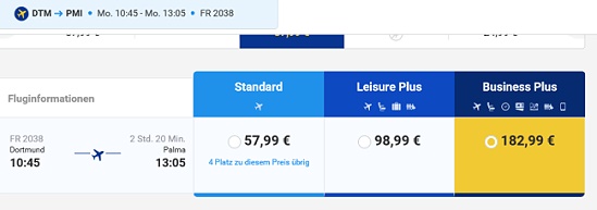 Es gibt 3 verschiedene Flugklassen. Standard (niedrigster Preis, nur Flug), Leisure Plus (inklusive 1 Gepäckstück bis 20 Kilo und Priority Boarding) und Business Plus (inklusive Priority-Sitzplatz, Fast Track - man kommt mit der ersten Gruppe in den Flieger - Ticketflexibilität, also Umbuchungsmöglichkeit und diverse Kleinigkeiten). Leisure Plus ist ca. 50 % teurer als Standard, Business Plus kostet ca. das dreifache.