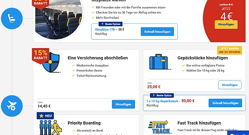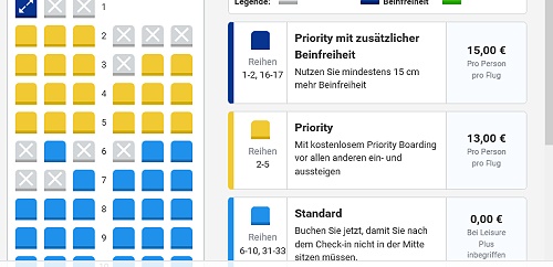Bei Standardbuchungen können im nächsten Buchungsschritt gegen Gebühr Sitzplätze ausgesucht werden, mit der Drohung in die Mitte einer Dreierreihe gesetzt zu werden wenn man es nicht macht.